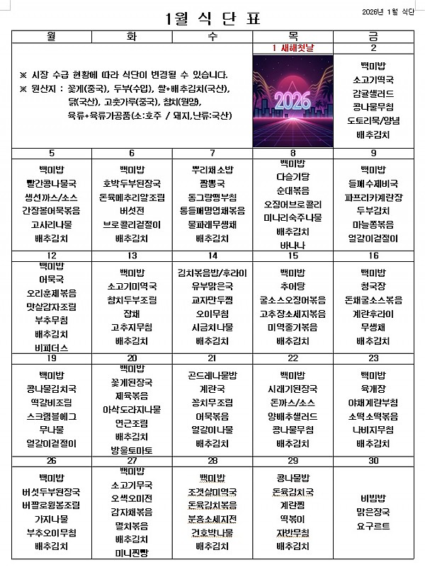 2026년 1월 식단표 ^^ 페이지 정보 작성자 관리자 작성일25-12-30 18:46 조회35회 댓글0건 이전글 다음글 목록 본문 새해를 맞이하여 밝고 건강한 마음으로 1월도 맛있게 먹고 열심히 일하겠습니다. ^^ 이전글 다음글 목록