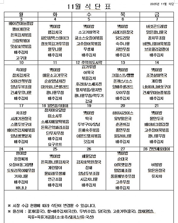 2025년 11월 식단표 ^^ 페이지 정보 작성자 관리자 작성일25-10-31 08:48 조회271회 댓글0건 이전글 다음글 목록 본문 11월에도 영양가 있고 맛있는 건강 식단을 먹으면서 열심히 달려보겠습니다! ^^ 이전글 다음글 목록