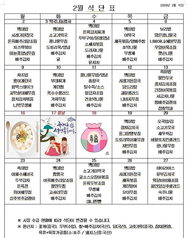 2026년 2월 식단표 ^^ 페이지 정보 작성자 관리자 작성일26-01-29 14:46 조회561회 댓글0건 이전글 다음글 목록 본문 2월에는 입춘도 있고, 설 명절도 있습니다. 2월에도 건강한 음식을 맛있게 먹고 열심히 일하겠습니다. 이전글 다음글 목록