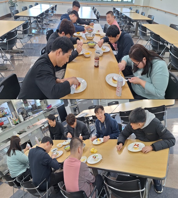 각자 시트에 생크림, 딸기쨈, 선호하는 과일로 꾸며서 예쁘게 꾸며보았습니다.