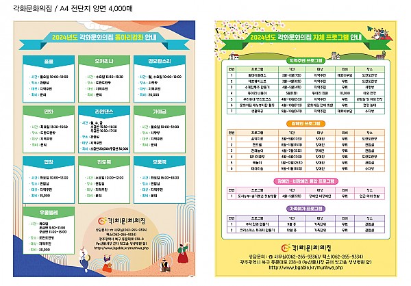 2024 동아리강좌 및 프로그램 안내 페이지 정보 작성자 정관용 작성일24-01-09 13:02 조회3,163회 댓글0건 다음글 목록 본문 각화문화의집 24년도 동아리강좌 및 프로그램 안내 올립니다.. 참고하시고 모든 분들 새해 복 많이 받으시길 바라겠습니다~~ 다음글 목록